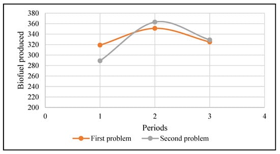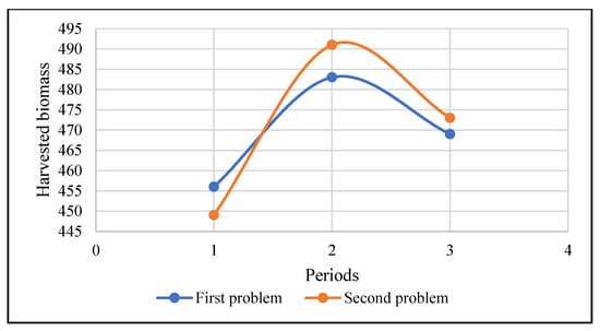 The quantity of harvested biomass in each period () is depicted for both considered problems in Figure 6.