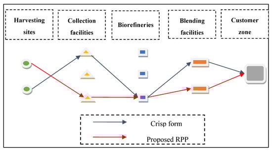 The goals of this study to minimize total costs as well as CO2 emission regarding appropriate BSCN design were achieved. Therefore, a schematic representation of the BSCN design regarding the obtained results from the proposed RPP approach and the crisp form of the proposed model can be useful. The aforementioned explanations are provided in Figure 9. In this case, both the proposed RPP approach and the crisp form of the proposed model considered a specified bio-refinery, but they selected different facilities for BSCN design.
