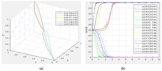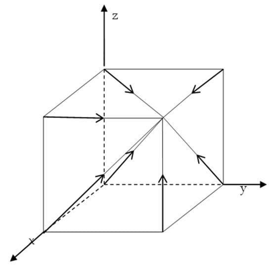 (2) When a non-core manufacturing company does not participate in shared manufacturing, and at the same time, the core manufacturing company provides low service levels, the profit of another non-core manufacturing company participating in shared manufacturing is less than that of not participating in shared manufacturing, that is, (L2 + Wi − Ci − Ni) < (Wi + Di − Ni − Si) (i = 1, 2). Table 4 displays the stability analysis of the equilibrium point. (0, 0, 0) and (1, 1, 1) are stable points, as shown in Table 4, and Figure 2 depicts the phase diagram. In this case, the decision of any participating shared manufacturing company will have an impact on other participating shared manufacturing companies. Analyzing this situation is the main goal of this paper.