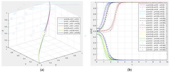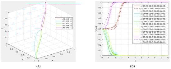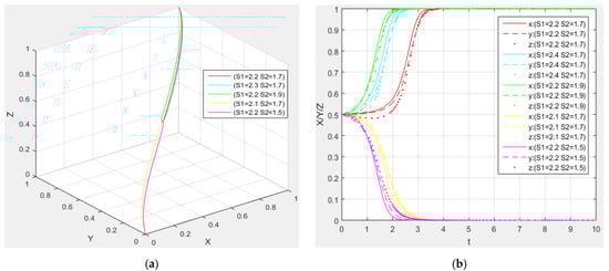 Adjust the additional income distribution ratio based on the initial value (α1 = 0.34, α2 = 0.25, α3 = 0.41). According to the real situation, the overall income of core company should not be less than zero when non-core companies participate in shared manufacturing, and core company offers high levels of service. See Figure 9 for the outcomes of the system evolution as it relates to each manufacturing company’s strategic evolution path.