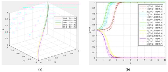 In this paper, MATLAB is used to simulate and analyze the impact of different parameters on the strategy evolution results. Referring to Qi et al. [28], the following parameter values of the simulation are set: x = 0.5, y = 0.5, z = 0.5, C1 = 10, C2 = 8, C3 = 13, C4 = 10, D1 = 2, D2 = 1.5, S1 = 2.2, S2 = 1.7, L1 = 10, L2 = 7.5, R1 = 50, R2 = 40, α1 = 0.34, α2 = 0.25, α3 = 0.41, V = 5. Matlab software is used for numerical simulation to analyze the changing trend of company’s evolutionary strategies.