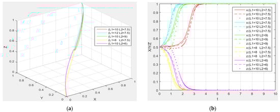 We adjust the additional income now based on the assumption that the additional income is (L1 = 10, L2 = 7.5) when only one non-core manufacturing company defaults, and we track the strategic development of each manufacturing company. Figure 7 displays the system’s evolution’s outcomes.