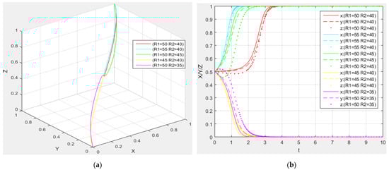 On the basis that the additional income when all non-core manufacturing companies participate in sharing is (R1 = 50, R2 = 40), we increase or decrease the additional income at this time and observe the strategic evolution path of each manufacturing company. The system evolution results are shown in Figure 8.