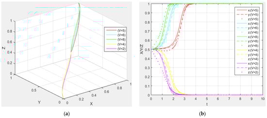 The excess income obtained by the core manufacturing company providing a high service level either increases or decreases based on the assumption that V = 5 (V represents the excess income obtained by the core company providing a high service level). We track the leadership that each manufacturing company is taking in terms of strategy. Figure 10 displays the system’s evolution’s outcomes.