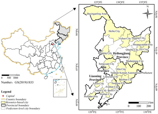 The three northeastern provinces (118°53′~135°05′ E, 38°43′~53°33′ N) are the collective name of the Heilongjiang, Jilin, and Liaoning provinces. The region is adjacent to Russia and North Korea, and there are 36 prefecture-level cities (Figure 1). According to the list of resource-based cities determined by the National Plan for Sustainable Development of Resource-based Cities (2013–2020) [41], there are 21 resource-based cities in the region (Table 1), and their area accounts for 59.94% of the total area of the three northeastern provinces, which is the most concentrated area of resource-based cities in China. As an important strategic resource security area, a critical commodity food base, and a “ballast” for national food security, the analysis of the evolution of land use in the three northeastern provinces and the investigation of the driving mechanism of land use change are essential for optimizing the regional land resource allocation and scientific regulation of land use and promoting the transformation and upgrading of resource-based cities and high-quality development. It is crucial for optimizing the allocation of regional land resources and scientific regulation of land use and promoting the transformation and upgrading of resource-based cities and high-quality development.
