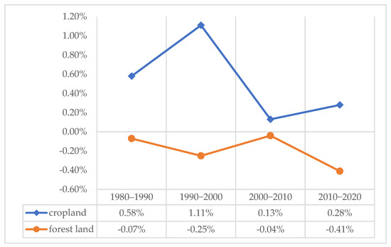 In general, the typical land use changes in the study area over 40 years mainly reflected the conversion of forest land to cropland, followed by cropland to forest land, in which the land use dynamics of cropland showed an apparent N-shaped dynamic trend and the land use dynamics of forest land showed a slow inverted N-shaped dynamic trend (Table 5, Figure 2). From this, it is easy to find that the increase in cropland and the decrease in forest land had a specific correlation.