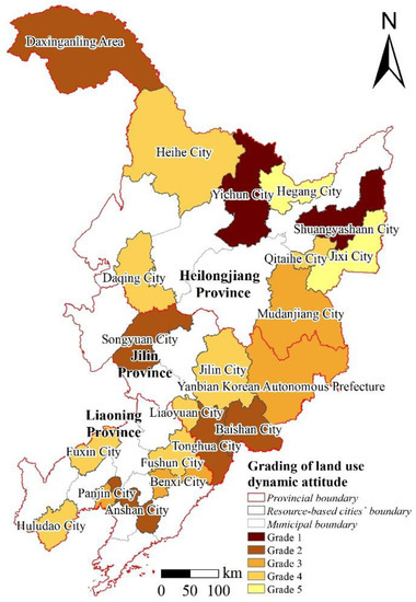 To further clarify the degree of dynamic attitudinal changes of land use in the study area, the degree of land use change in the study area was divided into five levels using the ArcGIS Natural Breaks (Jenks) method (Figure 4), with level 1 indicating the most significant degree of changeand decreasing level by level. As can be seen from Figure 5, the prefecture-level cities with the most significant degree of land use change in the study area from 1980 to 2020 were Yichun City and Shuangyashan City, which are adjacent to the Russian border, mainly embodied in the change of forest land to unused land and cropland. The cities with the next highest degree of change were Daxinganling Area, which is adjacent to the Russian border, Baishan City and Tonghua City, which are adjacent to the Korean border, as well as Songyuan City and Anshan City, where the change in land use was mainly reflected in the transfer of forest land to cropland. The cities with the degree of change in land use dynamics of grade 3 included Mudanjiang City and Yanbian Korean Autonomous Region, which are adjacent to the border with North Korea, and Benxi City and Panjin City, where the change in land type was mainly reflected in the transfer of forest land to cropland. The rest of the resource-based cities had relatively inactive land use dynamics. Among them, Heihe City, which is adjacent to the Russian border, and Daqing City, Qitaihe City, Jilin City, Liaoyuan City, Fuxin City, Fushun City, and Huludao City were in level 4 of land use dynamics, mainly reflecting the transfer of forest land to cropland and Jixi City and Hegang City had a minor level of land use dynamics, mainly reflected in the transfer of grassland to cropland.