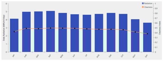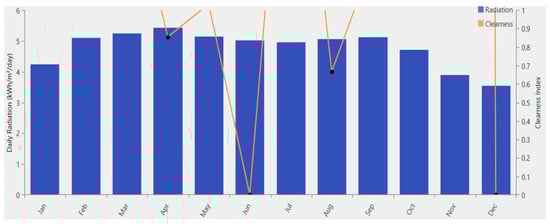 Two locations have been chosen. The first is Pekan, Pahang, on the east coast of Peninsular Malaysia, which has enough solar energy to generate electricity. Solar energy and wind energy resources are obtained from NASA Prediction of Worldwide Energy Resources in the HOMER Pro software. Figure 5 presents a monthly global horizontal irradiance (GHI) for the location of Pekan, Pahang.