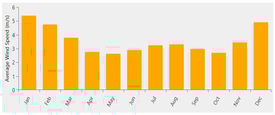 The annual average of solar GHI was 4.79 kWh/m2/day, with the highest average monthly radiation in April at 5.420 kWh/m2/day, while the lowest GHI was in December at 3.55 kWh/m2/day. Figure 6 illustrates a monthly wind resource for the location of Pekan, Pahang.