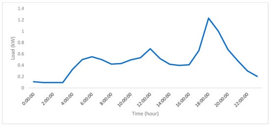 The load demand for both rural areas is depicted in Figure 9 throughout the length of one day. According to Figure 9, the hours between 6:00 and 8:00 pm had the greatest load demand, equivalent to 1.231 kW. Conversely, the load demand was at its lowest at 0.095 kW between midnight and 3:00 am.