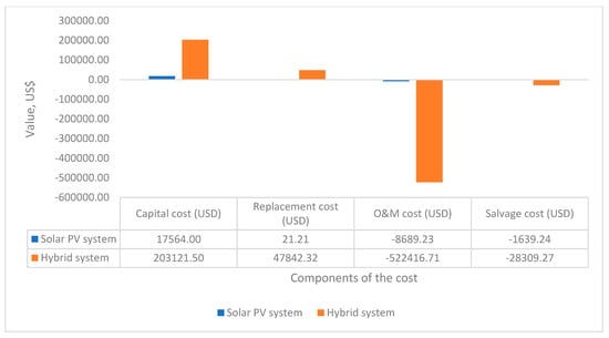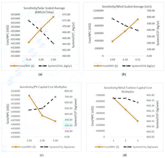 There are four components in the cost analysis: capital cost, replacement cost, salvage cost, and operation and maintenance (O&M) cost. The capital cost and O&M cost significantly influence the system’s net present cost. Capital expenditures are cash outflows, while operations and maintenance expenditures are cash inflows. The capital cost parameter in the sensitivity analysis shown in Figure 13 and Figure 14 reduces the NPC of the RE system while concurrently influencing its carbon dioxide emissions. The component costs are estimated depending on the simulation’s input parameters. The greater the negative value of NPC, the shorter the system’s payback time.