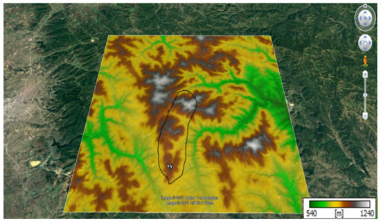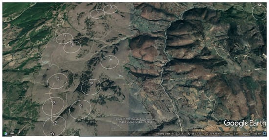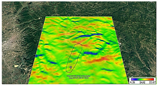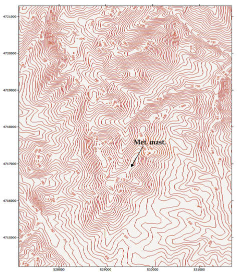 In this study, the terrain considered for a possible wind farm is in Koznica (42°39′32″ N 21°22′30″ E). The target site can be characterised as moderately complex, in terms of terrain topography. The space provided for the construction of a WPP comprises the periphery of rounded hills. The altitude at the target location varies from 980 m to 1070 m. The ridges are rounded, so vortices typical of an escarpment are not expected to occur, as shown in Figure 1.