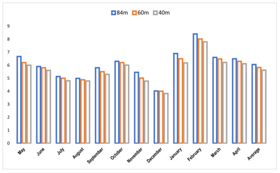 For Koznica, a mountainous terrain, one-year wind-speed measurements from 2019–2020 were considered. There are no buildings on the micro-location considered. Measurements at the highest level, 84m, show a high potential of wind energy. Figure 2 gives the graphical presentation of the data for each month and their average value for the respective heights. Analysing wind-speed data from June to September shows that there is an almost constant wind-speed value in the summer months. The month with the highest speed, at all measurement heights, is February.