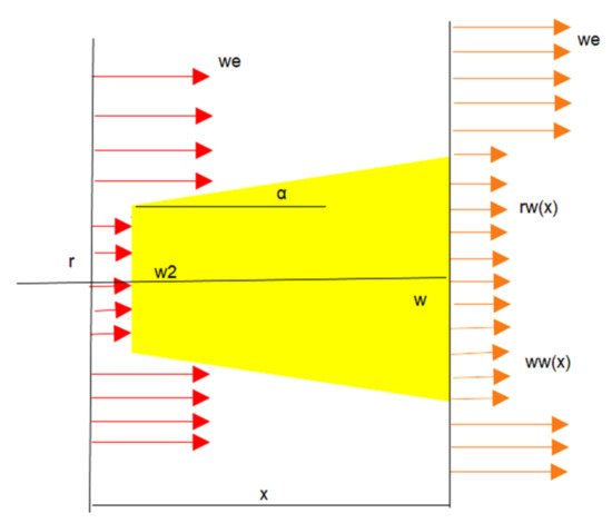 where: w0 is the wind speed before reaching the turbine rotor, (m/s), then, behind the rotor, the wind speed is shown by w2, (m/s), the obtained radius–as a result of the wind speed change, is shown by rw, for a distance of x (m), with r showing the wind turbine radius, in m [37]. Then, the entrainment constant is shown by X, (/) [37]. CT shows the coefficient of wind-speed pressure, (/). ww is the wind speed in a distance of x, (m/s) [37]. α indicates the deviation angle of the wake-speed deficit during the passage through the rotor of the respective turbine [37].