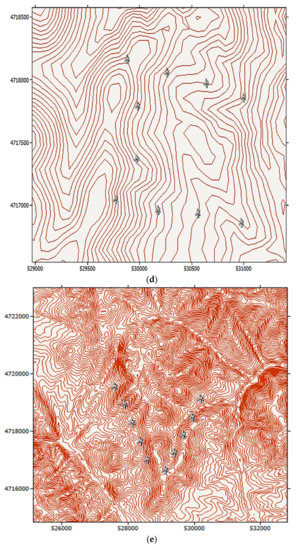 Throughout all the figures presented, the area under consideration for placing the turbines is indicated by a black circle. As mentioned above, and in field analysis, a very important element is the elevation of the terrain because it affects the speed and density of the air. This is described in Figure 6. From this Figure, it can be seen that along the whole terrain in which the analysis is performed, the elevation change is bigger for the 5D distance, and this is also related to changes in wind speed. The Koznica site area can be categorised as moderate complex terrain, with altitudes varying between 980 and 1070 m above sea level.
