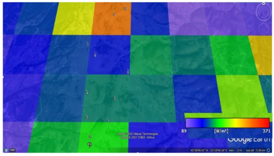 The further placing of such positions on the power density map and their distribution along the territory—here indicated by a circle—is shown in Figure 10. The analysis continues by presenting the power density at the location considered. Considering the location of the turbines, as shown in Figure 11, it can be seen that the turbines in the optimal layout are located in places with the highest wind power density.