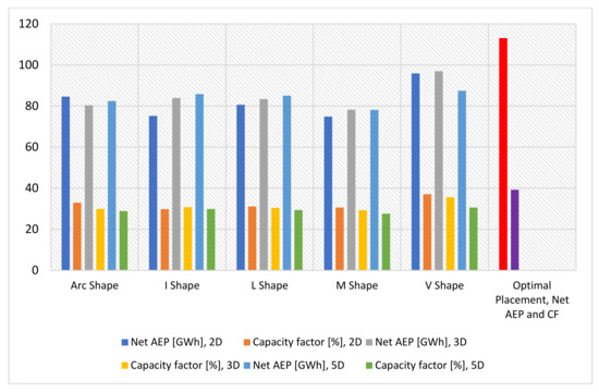 The placement forms are discussed below and shown in Figure 9, for all three distances: 2D, 3D, and 5D. These show all the forms achieved, according to the mentioned models. Annual energy generated and capacity factor, achieved in each scenario by considering the wake losses caused in the respective scenario, are calculated. Then the layout, which indicates more considerable energy production, and the capacity factor, assists in finding the optimal form.