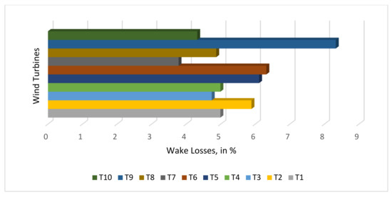 Optimal placement, in this case, refers to the distance 5D or further and to maintaining the same height, as much as possible, along the terrain. As shown in Figure 13, here a capacity factor of 40% can be achieved, in the case of optimal placement. It can also be seen here that, in this case, there is less energy at the output and a lower capacity factor for the 5D-distance case, according to some scenarios. This is related to the fact that to realise that type of placement for such distances involves considering the many terrain reductions, i.e., there are slower speeds throughout the year and a kind of wake effect as a result of the differing marked terrains: the ups and downs. For all the layouts considered here, the most considerable annual energy output will be from layout V. Regardless of the distance, the smallest capacity factor achieved is in layout M, where the capacity factor is around 20%. The wake effect, in this case, is more pronounced because the changes in height above ground level are numerous. The average value of wake loss for the considered type of wind turbine is 4.73%. Of course, this represents the average value, and other values, as a function of position, are shown in detail in Figure 14. It can be seen that even in the optimisation scenario, the ninth turbine has a high loss value due to the wake effect.