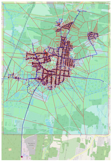 - Okabe, A.; Satoh, T.; Furuta, T.; Suzuki, A.; Okano, K. Generalized net-work Voronoi diagrams: Concepts, computational methods, and applications. Int. J. Geogr. Inf. Sci. 2008, 22, 965–994. [Google Scholar] [CrossRef]