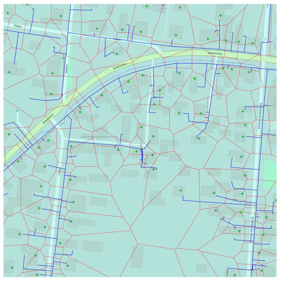 - Guth, N.; Klingel, P. Demand Allocation in Water Distribution Network Modelling—A GIS-Based Approach Using Voronoi Diagrams with Constraints. In Application of Geographic Information Systems; IntechOpen Limited: London, UK, 31 October 2012. [Google Scholar] [CrossRef]