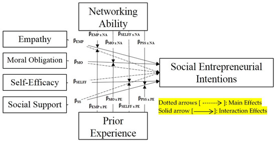 While commercial entrepreneurship intention has received extensive attention and the antecedents thereof investigated in extant literature [14,15,16,17], not very much has been done empirically to ascertain subjective norms that could predicate the social entrepreneurship intentions. Although the determinants of SEIs have been examined among students [18], nonprofit agencies [19], universities [20], pre-service teachers [6], members of incubator programs [1], and budding entrepreneurs [21], there remains a need to examine these determinants of SEI in a developing context as suggested by Igwe et al. [21], since most of these studies were done in developed contexts. This is necessary because environmental conditions for entrepreneurial proclivities have been found to play a crucial role in determining the choices of individuals intending to venture into entrepreneurship [22]. Moreover, whereas the moderating influences of empathy [21,23], self-efficacy [12], sample composition and national economic stage [11], moral obligation [24], education [25], and perceived social support [20] have been studied, networking ability has not been investigated as a moderator although it was examined as a predictor [21]. We suggest that both prior experience of the entrepreneur and networking ability with other actors in one’s social network can provide inimitable resources that would spur the individual into honing social entrepreneurial ambitions. Hockerts [13] shows that experiences garnered from working with similar social firms as well as participating in community service would provide the technical skills and acumen needed to facilitate prosocial behaviors such as social entrepreneurship; while Ernst [26] also revealed that prior knowledge about the nature, causes, and solutions to social problems would positively impact social entrepreneurial attitudes and intentions. Networking ability enables the budding social entrepreneur to take advantage of the financial and social resources embedded in his/her social network in order to develop new products and services that perhaps would solve social problems in the society [27,28]. Based on these theoretical allusions, we aim to determine which of prior experience or networking affects social entrepreneurship intentions more in a developing context.