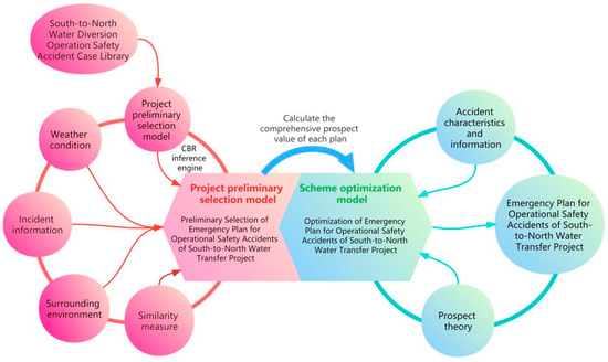 The middle route of the South-to-North Water Diversion Project is one of the crucial frameworks of China’s water network and an essential channel for water resource allocation in North China. The safe operation of the project has a huge impact on regional economic development, social stability and other aspects. The objectives of this research are to improve the disposal efficiency of all kinds of accidents during the operation of the Middle Route of the South-to-North Water Diversion Project, reduce people’s property losses and ensure the safety of water supply along the line. This paper will put forward a new emergency decision-making method based on case-based reasoning technology and prospect theory. The method is divided into two parts: (1) Collecting the historical case information and building the case library. The frame representation in the case-based reasoning technology is used to describe the characteristics of historical cases and adopt the two-level method of historical cases fast retrieval and similarity fuzzy matching retrieval to complete the preliminary selection of emergency plans; (2) The decision-making and optimization model of disposal plans based on prospect theory, namely, using the value function and probability weight classification to measure the prospect value of similar schemes and selecting the optimal disposal scheme, in order to improve the science and rationality of the decision-making results. Finally, examples are taken to verify the feasibility and effectiveness of the method.
