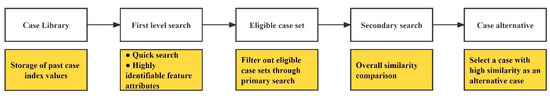 Case retrieval is generally sorted based on the overall similarity between the target cases and historical cases. The overall similarity is usually composed of three parts: attribute similarity, structural similarity and attribute weight. With the increasing number of cases in the system, the scheme screening only with the attribute similarity between cases will lead to the retrieval rate and accuracy. At the same time, due to the complex categories and number of the middle route of the South-to-North Water Diversion Project, this article improves the efficiency of case retrieval by constructing a two-level retrieval strategy. The retrieval process is shown in Figure 4.