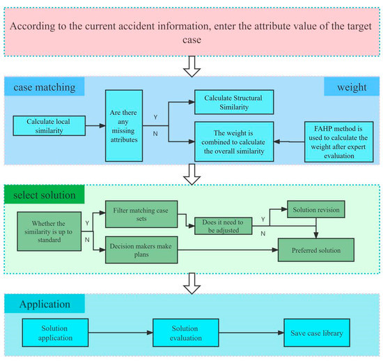 Extract the attribute value to enter it into the retrieval matching model by obtaining the detailed information of the current accident case, and screen similar cases and correct the disposal scheme by matching the overall similarity. Finally, the most reasonable disposal scheme is preferred through expert decision-making. The emergency decision-making process based on case-based reasoning is shown in Figure 6.
