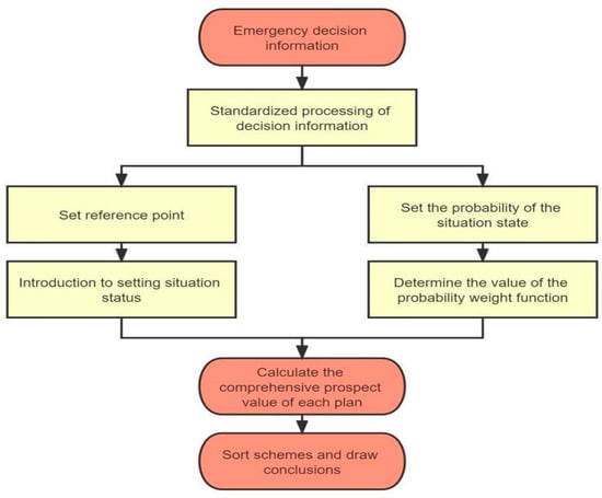 - Scheme optimization model based on prospect theory. For the candidate case set selected by the primary selection model, standardize the data, set the reference point and the probability of the situation state, determine the probability weight function value, and finally, calculate the comprehensive prospect value of each scheme, and sort them to obtain the optimal scheme. The research process is shown in Figure 3.