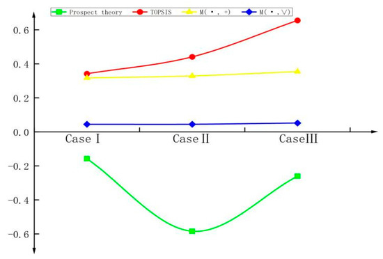 The evaluation results of the scheme calculated based on the five mathematical models of the two models are shown in Table 22 and Figure 10. According to the results shown in the table, excluding the two failure operators and , the results obtained by the remaining TOPSIS method, operator and operator are , while the result calculated by the prospect theory in this paper is , which is contradictory. Because decision-making information is one of the important bases for emergency decision-making in unconventional emergencies, the important content of emergency decision-making is the information collection, processing, feedback and other processes. Considering that the safety accident scenario of the project operation is not exactly the same, and different accidents have differences in weather, environment, human factors, etc., and the emergencies have the characteristics of a sudden incident, high time pressure and unprecedented reference, which determines that the decision-making information in the emergency situation is extremely lacking and difficult to obtain objective decision-making methods often cannot fully take into account the actual situation, and cannot achieve a correct and objective judgment based on the actual situation. Prospect theory considers subjective factors such as loss aversion of decision makers, and cognition of decision information among decision-makers varies. Therefore, in the face of highly uncertain information and incomplete information, the decision-making individuals in the decision-making group have different knowledge, experience, personality, etc., have different information cognition and risk cognition, different decision-makers’ personal preferences and cognitive biases, so the final decision-making program selection has a certain impact. Therefore, based on the actual experience of the decision-maker, using prospect theory to select the program can get more convincing results.
