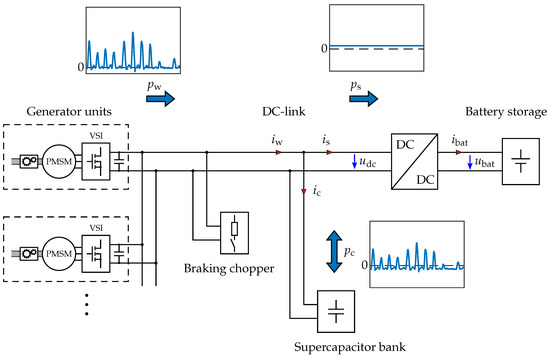 To smooth this fluctuation with battery storage, it must be sized for the peak current, which can be costly. Furthermore, the very high number of cycles reduces the lifetime of the battery. When using a hybrid system consisting of batteries and supercapacitors, the battery storage can be smaller and will last longer. The supercapacitors, with their high power density, can withstand the high current peaks, while the batteries, with their high energy density, can provide or store the power over a long period of time [18,19,20].