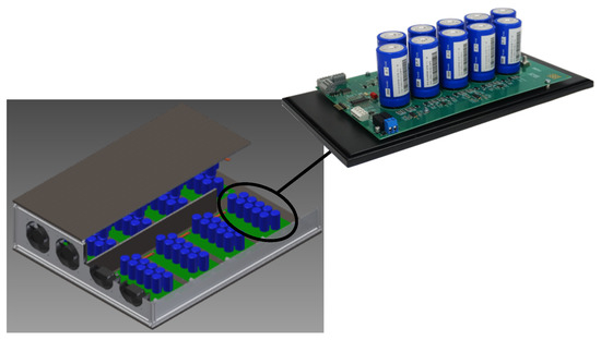 Here, the maximum allowed DC-link voltage is . Therefore, at least 149 cells in series are necessary. The developed supercapacitor bank consists of in series connected cells, divided into 16 modules with 10 cells each.