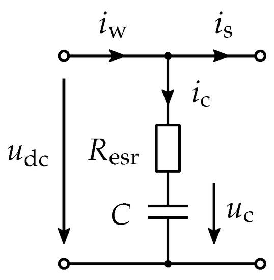 The bank is modelled as an RC model, as shown in Figure 4. More detailed models, such as the RC parallel branch model, are not considered, as the dynamic behaviour of the RC model is sufficient for this case [37,38]. The current induced by self-discharging and balancing is neglected in the model, as it occurs over a longer period of time during which several waves appear, and is, therefore, not relevant to the dynamic behaviour.