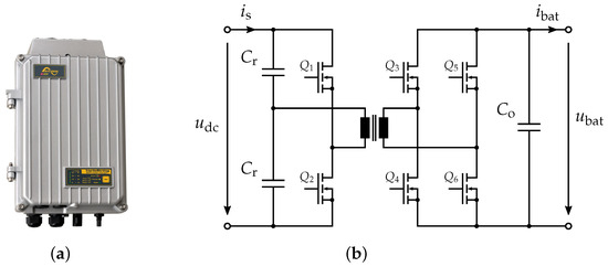 Figure 5a shows the DC/DC converter VarioString VS-70, made by Studer Innotec, which is used to charge 48-V-batteries from the DC-link. The VarioString is designed to be installed in a photovoltaic application, however, the specifications, listed in Table 3, are perfectly suited for the application considered here. The very high efficiency is made possible by an LLC resonant half-bridge topology, shown in Figure 5b. This topology allows Zero Voltage Switching (ZVS), which leads to very low switching losses [41].