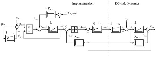 The control of the DC-link voltage allows now to control the energy in the supercapacitor bank, see Equation (5). To keep the battery current constant, the power through the DC/DC converter must be constant as well. This power is converted to the lower voltage level of the batteries. Since the battery voltage is nearly constant, the constant power flow implies a constant charging current of the batteries. Hence, the power should be the average of the generated power . Filtering the generated power with a low pass filter, which has a very low cutoff frequency, gives the averaged power . The desired power through the capacitance of the bank can be calculated as