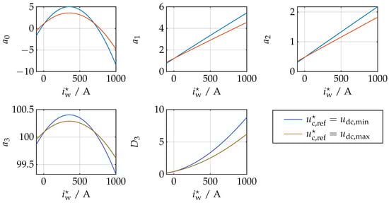 The determinate also leads to a fourth-order polynomial in the arguments , and (due to squaring of ), which is why a numerical approach is chosen to prove the positivity for various operation points. Therefore, the physical constraints are included and used accordingly to account for the worst-case. Figure 7 shows the coefficients to and the determinant over the input operational current and for two different reference voltages and . Further analysis shows, that the worst-case of stability is if the reference voltage is set to the minimum DC-link voltage , the current flowing into the DC/DC converter is set to and the current is set to zero, which is shown by the blue curves in Figure 7.