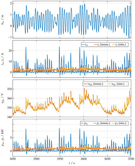 The DC-link voltage , shown in the third subplot can be reproduced very well by the simulation. The average voltage is about the aimed , which is achieved by the restoring component , defined in Equation (15). The DC-link voltage can be used to determine the power generated. Each wave causes a high current flow into the supercapacitor bank, resulting in a voltage peak, induced by the ESR of the capacitors. Therefore, its modelling is especially important to calculate the reference voltage correctly. Disregarding these voltage peaks, there are grouped time intervals where more energy is generated than in others. This results from the tendency for larger waves to be grouped together, which is called wave groupiness ([1] Section 3.3.4), [47]. This can also be concluded from the movement of the lifting rod. Thus, power smoothing must not only smooth the power between two waves but also over these sets of waves for a longer period of time.