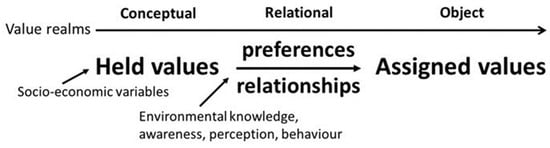 Brown’s (1984) work on the concept of value was chosen as the conceptual framework as it is arguably the basis of the idea of SCV (Figure 3) []. He proposed that held values lead to the expression of assigned values through preferences and the relationship between the individual and the object being valued []. Socio-economic variables were assessed in the study since individuals perceive and therefore value ES differently according to their socio-cultural backgrounds [,,]. Since urban parks are common resources, the respondents’ social value orientation (SVO) was also measured to represent their concern for others when making decisions about allocating resources []. Environmental knowledge, awareness, perception, and behaviour were assumed to influence people’s preferences and their relationship to nature.