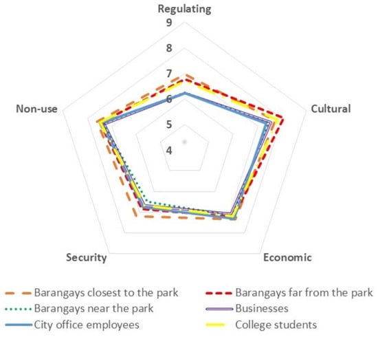 A comparison of how each stakeholder group values the different types of ES is in Figure 4. All the stakeholder groups except for city office employees assigned the highest values to cultural ES, followed by non-use, economic, security, and regulating ES. City office employees assigned higher values to non-use than cultural ES, followed by economic, security, and regulating ES. Based on Kruskal–Wallis H tests, there was no significant difference in how barangays closest to the park value the different types of ES, χ2(4) = 1.345, p = 0.854. It was the same for city office employees, χ2(4) = 4.809, p = 0.307. However, there was a significant difference in how the barangays far from the park valued the different types of ES, χ2(4) = 17.420, p = 0.002). Pairwise comparisons using Dunn’s (1964) procedure with a Bonferroni correction for multiple comparisons revealed statistically significant differences in the values given by barangays far from the park to security (mean rank = 178.59) and cultural ES (244.65) (p = 0.003) and regulating (181.27) and cultural ES (244.65) (p = 0.006).