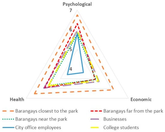 A comparison of how each stakeholder group values the different types of EDS is in Figure 5. All the stakeholder groups assigned higher values to psychological EDS, followed by economic and health EDS. Kruskal–Wallis H tests revealed that there was no significant difference in how barangays closest to the park value the different types of EDS, χ2(4) = 0.408, p = 0.816. It was the same for barangays near the park, χ2(2) = 4.161, p = 0.125; businesses, χ2(2) = 1.051, p = 0.591; and city office employees, χ2(2) = 4.164, p = 0.125. In contrast, there was a significant difference in how the barangays far from the park valued the different types of ES, χ2(2) = 6.086, p = 0.048. There was also a significant difference in how college students value the different types of ES, χ2(2) = 7.021, p = 0.030. Pairwise comparisons using Dunn’s (1964) procedure with a Bonferroni correction revealed a statistically significant difference in the values assigned by college students to economic (mean rank = 401.90) and health ES (440.31) (p = 0.031).