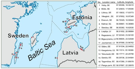 The beach wrack material applied for the investigation was obtained from the central to northern Baltic Sea region at 17 sampling points (sandy beaches) located in southern Sweden, western Estonia, and Latvia, by the coastal towns and villages, as shown in Figure 2.