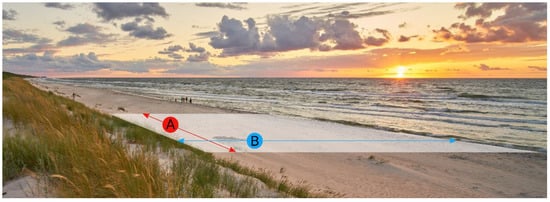 Typical beach wrack sampling sector at the seaside coastline: fixed 100 m length (A) in relation to variable site-specific beach width (B) (photo of the Baltic Sea coast in Poland taken by Radek Kucharski (137294100@N08/51380554569) and retrieved from flickr.com, San Francisco, CA, USA).