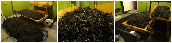 Before the gasification, dewatering and air-drying by spreading macroalgal biomass on metallic mesh in a 100–150 mm layer (Figure 4) were implemented, ventilation was applied at a temperature of 30–40 °C for about 72 h [44].