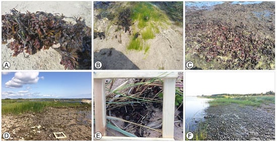 The term ‘beach wrack’ (also known as seaweed cast ashore in masses, storm-cast beach wrack, beach strand, wrack band, or beach-cast sea wrack) is attributed to a material washed from the sea and accumulated on beaches due to natural marine movements induced by area-specific hydrodynamic and climatic conditions. The bulk of beach wrack masses usually consists of organic material compiled of aquatic vegetation biomass and remains of marine organisms at different stages of decomposition. Another part, the mineral material in beach wrack, is variable and mainly comprised of sand and rock particles. Waves, tides, currents, and storms are the most significant factors affecting beach wrack composition and accumulation amount, time, and place [16,17,18]. Furthermore, the anthropogenic impact on beaches and beach wrack masses is inevitable, and litter admixture is always present to a greater or lesser extent [19,20,21].