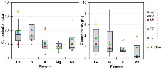 In the composition of beach wrack, major elements such as Ca (16.95 g/kg), S (16.11 g/kg), K (9.75 g/kg), Mg (8.63 g/kg), and Na (7.56 g/kg, indicating total mean values, respectively) prevailed, followed by Fe (2.35 g/kg), Al (1.77 g/kg), P (1.39 g/kg), and Mn (0.33 g/kg) (Figure 6); they are listed among inorganic-forming elements [4]. The range of elements varied quite widely, but the most compact ranges were addressed to Mg (3.99–12.02 g/kg) and P (1.10–3.13 g/kg), indicating their more or less constant concentration in the samples of beach wrack.