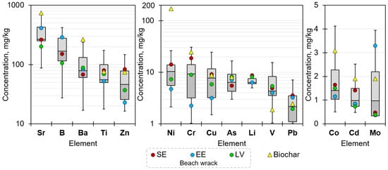 Differences among the sample origin by country indicated that samples from Estonia contained considerably lower than mean concentrations of Zn, Ni, Cr, and Cu, but higher Sr, B, and Mo. Considerably higher than mean concentrations of Zn, Ni, Cr, Li, and Pb were detected in beach wrack from Sweden. The concentrations of minor elements in samples from Latvia were closer to the total mean, except for Li, which exceeded it, and for Sr, Ba, Cd, and Mo, which were lower.