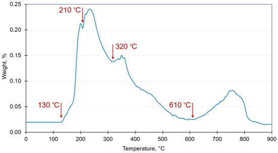 The first decomposition maximum for the beach wrack was reached at 130 °C, which is related to the loss of adsorbed water molecules and also the volatilization of light organic compounds. The following maximums occurred at 180–250 °C, 320–380 °C, and 610–770 °C, implementing thermal conversion of carbohydrates. The thermal behavior of the beach wrack was in agreement with similar findings reported in the literature where algal biomass was used for energy production [44,70,72].
