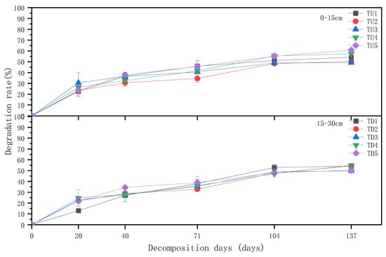 The degradation rate of returned straw was approximately 55% in the 0–15 cm tillage layer and approximately 50% in the 15–30 cm layer during the test period (Figure 2). The straw degradation rate was faster at the early (0–20 d) and mid-late (71–137 d) stages of field return. The average degradation of straw was approximately 20% at the early stage of return (0–20 d) and 10% at the middle and late stages (71–137 d). The straw degradation was slow in the middle and early stages (20–71 d) and late stage (104–137 d). The straw degradation rate showed a decreasing trend with increasing depth of returning straw at the same period and at the same N application rate. The degradation rate of straw returned to the field was higher at high N application rates (TU4, TU5, TD4, and TD5).