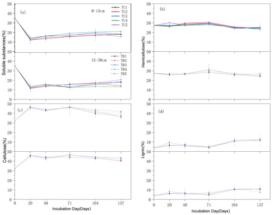 The percentage of soluble matter in the straw residue at the early stage of returning (0–20 d) decreased significantly by approximately 20%, while the percentage of cellulose increased significantly by nearly 15% (Figure 3). As the return time increased (20–137 d), the proportion of soluble substances and lignin in the returned straw residue increased, while the proportion of cellulose and hemicellulose decreased. The percentage of hemicellulose and lignin fluctuated less during the test period. In the middle and late stages of return (71–104 d), the proportion of soluble matter increased by approximately 5% and the proportion of lignin increased by nearly 10%; the proportion of cellulose and hemicellulose decreased by nearly 5% on average. The percentage of soluble matter generally decreased, and the percentage of lignin generally increased with the increasing depth of return to the field for the same period and application rate. The percentage of soluble matter was higher, while the percentage of lignin was lower in all treatments (TU4, TU5, TD4, and TD5) under high N application.