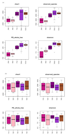 Miseq sequencing was performed to obtain pair-end (PE) double-end sequence data, and the measured Fastq data were quality-controlled using Trimmomatic (v0.36), Pear (v0.9.6), Flash (v1.20), and Search (v2.7.1). The final quality of the Fasta data was obtained via processing. The specific parameters were as follows: (1) quality control of Fastq data using Trimmomatic and Pear. For Trimmomatic, a sliding window strategy was used with a window size of 50 bp, an average quality value of 20, and a minimum retained sequence length of 120, while Pear was used to remove sequences with N. (2) Flash and Pear were used to splice (merge) the two end sequences according to the overlapping relationship of PE, with a minimum overlap of 10 bp and a mismatch rate of 0.1; the Fasta sequence was obtained. (3) The chimeras of the Fasta sequence were removed using the Uchime method according to the known database, while the unknown database was removed using the Denovo method, along with short sequences that do not meet the requirements. The representative sequences of OTUs were classified and identified using the SILVA database (SILVA 138).
